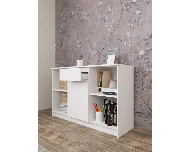 ТВ тумба с полками на полка держателях, створкой на накладных петлях и выдвижным ящиком на роликовых направляющих. На фасаде ящика отсутствуют ручки, функцию ручек выполняет сам фасад (его верхняя часть с внутренней стороны прямая под углом 90°). Открывание ящика производится за счет пространства между планками и фасадом.