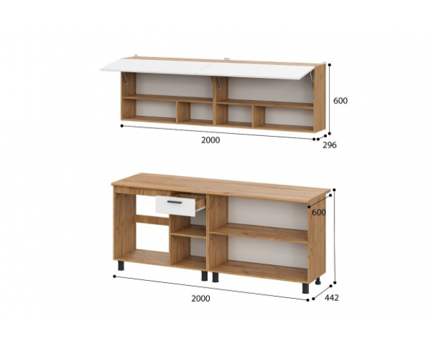 - комбинированный стол шириной 1000 мм, одна половина которого отсек для хранения с ящиком и полкой шириной 400 мм, вторая половина предназначена для установки мойки шириной 600 мм;